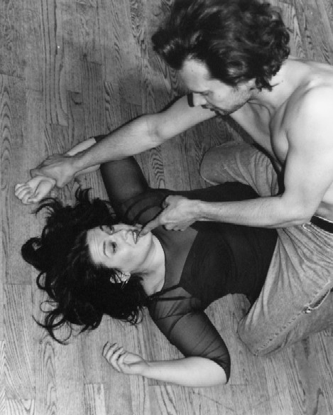 | SISSY (Samantha Swan) drunkenly dances as JOE (Giuseppe Gallaccio) throws The BARFLY (Sergio Gallinaro) out of his bar. SNAPSHOT (2000)- Toronto. Photo by Reta Godlevskis. |